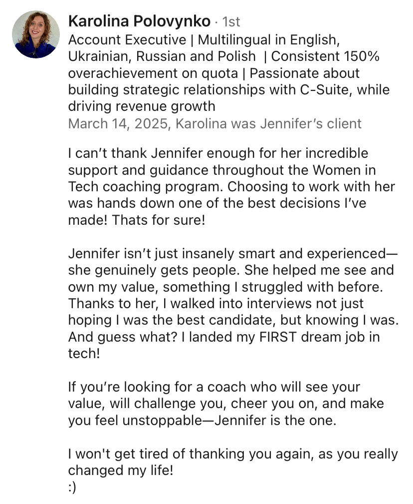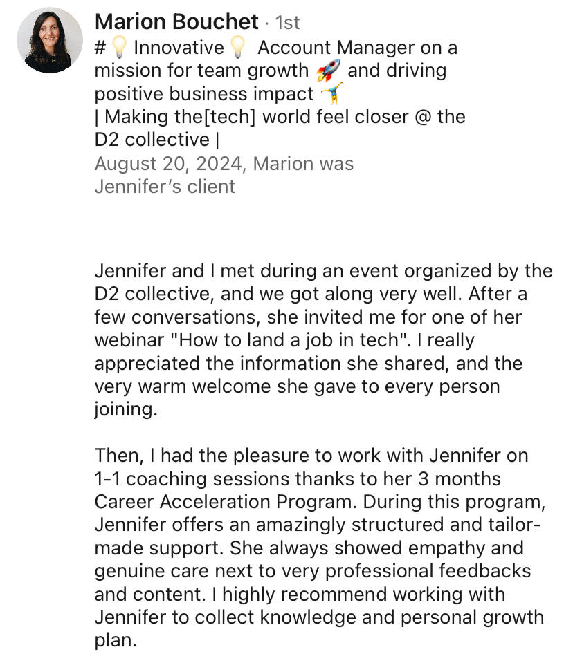 - Feeling like you've totally outgrown your current role, but honestly not sure what you actually want next after years of just taking good opportunities that came your way.- Watching other women land amazing roles at Tech companies you'd actually want to work for, while you're stuck playing the regular application game that doesn't work at mid-senior level.- Knowing you're really good at what you do but struggling to explain your value in a way that makes people go "wow, we need her on our team".- Feeling that spark that says it's time for your next big career leap. You've built great experience, and now you're ready to leverage it for a role that truly excites you.- Getting interest from companies (which confirms you're on the right track!) and ready to transform those first-round interviews into job offers by understanding exactly what makes candidates stand out.- Knowing you should be earning way more but not sure how to have those conversations without feeling awkward or pushy.- Aware your LI page is old and outdated, and you’re missing out on the fact that if you had an optimized profile you’d be getting more recruiters reaching out to YOU.