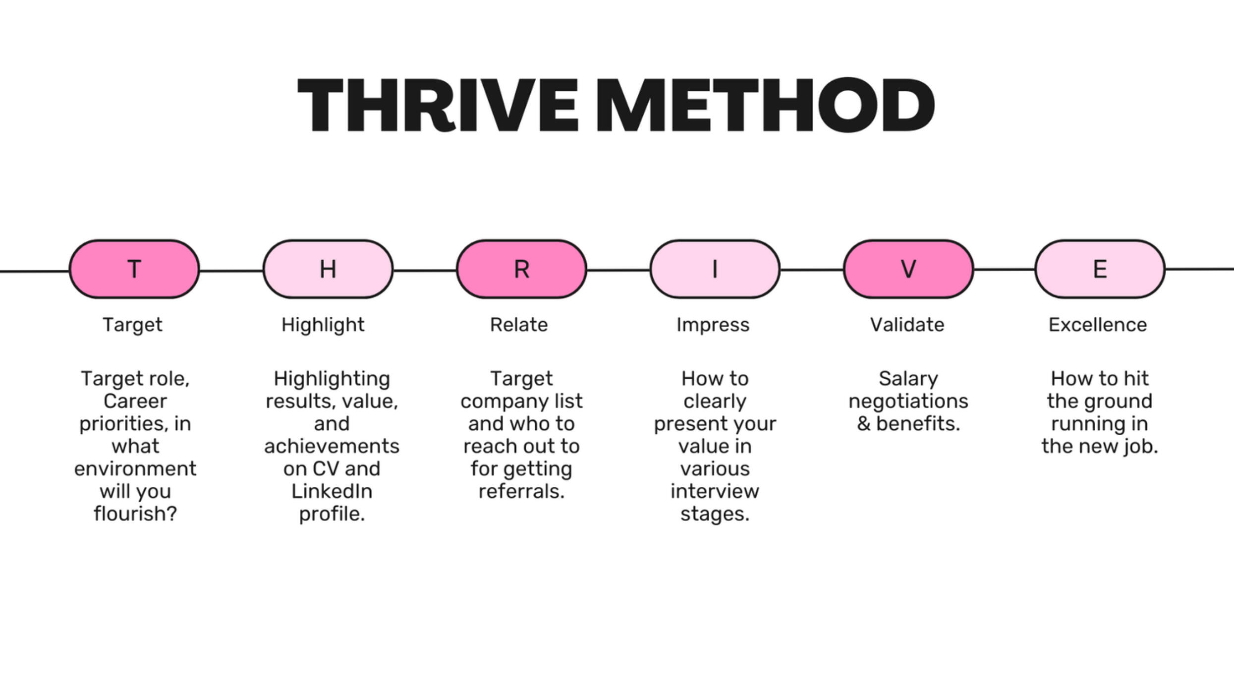 7 Modules with video lessons that break down the step-by-step THRIVE process to land offers.